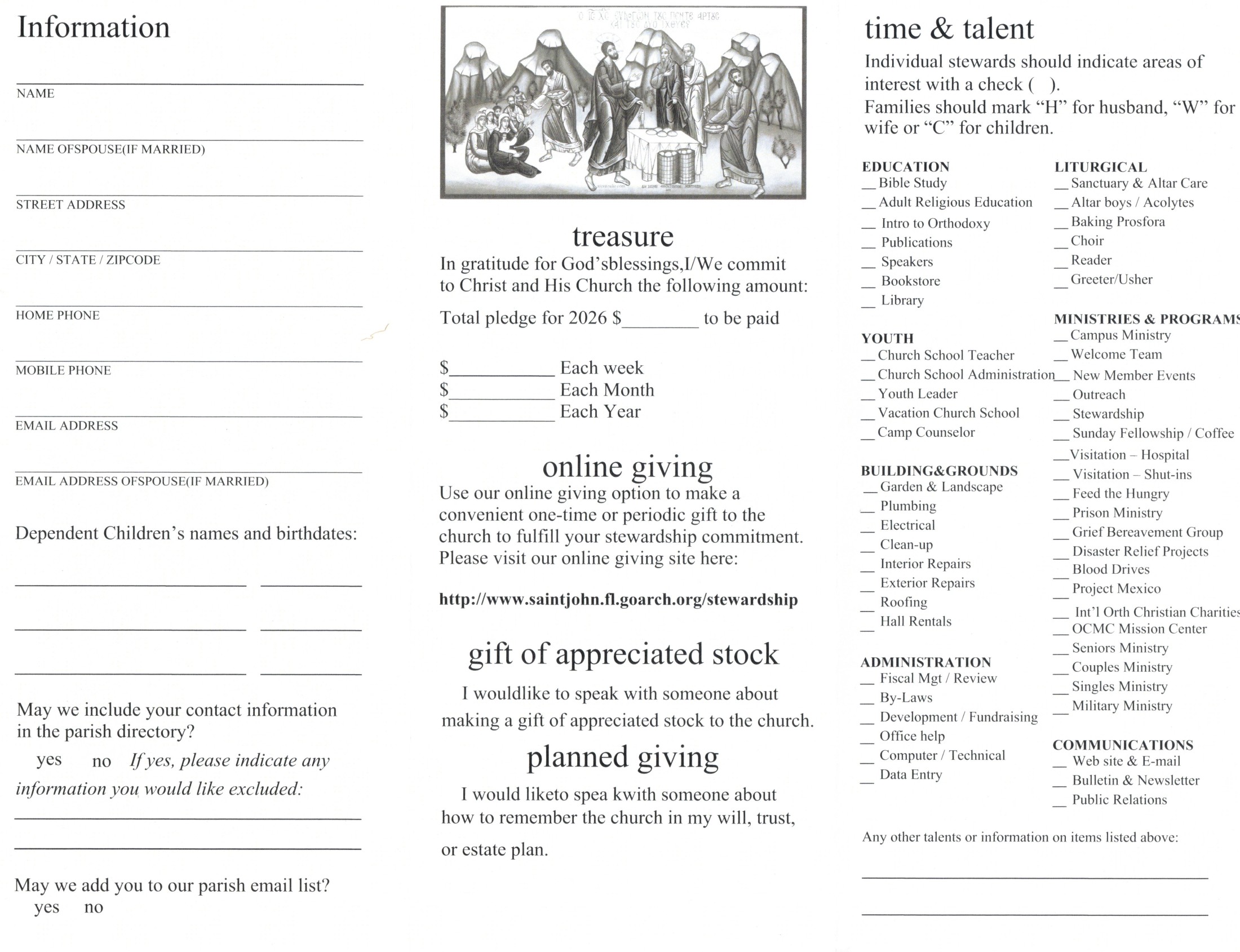 You may also print this year's Pledge Card by clicking here ,Provide the information requested about you and your family by filling the required fields, indicate the amount of this year's Stewardship Pledge and then hand it in at the Church or mail it directly to the Church with an enclosed check.